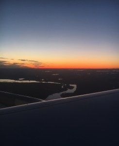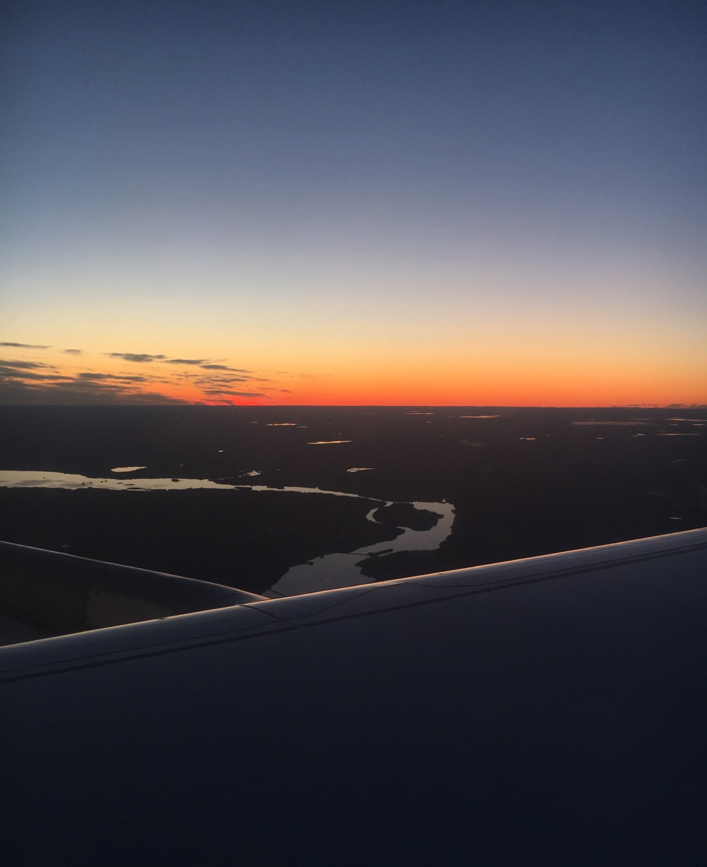 Maisema lentokoneesta Rovaniemen ja Oulun välillä. Ihana jokien ja vesien sekä metsän pilkottama maa ja vielä kun sen kruunasi auringonlasku.