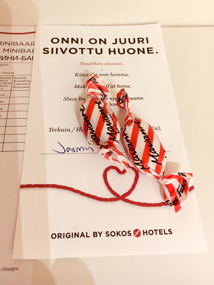 Huone oli siisti ja tykkään tästä trendistä, että huoneessa on lappu, josta näkyy kuka huoneen on minua varten siivonnut. Tällä kertaa asialla oli ollut Jasmin. Kiitos Jasmin!
