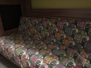 Esikoisen naama venähti kun hän näki huoneen. Ensinnäkin huoneen värimaailma oli hyvin persoonallinen, ruskeaa ja vihreää. Kolmas sänky oli kerrossänky (en varmasti tilannut kerrossänkyhuonetta), jonka alapeti oli vuodesohva. Vuodesohvan kuosi oli vanhanaikainen. Minua ei ympäristön retroilme haittaa yhtää, mutta esikoinen oli erittäin pettynyt. Minusta on ihan sama minkälainen sisustus on, pääasia valitsemassani paikassa tietysti on se kylpylä, joten sitten vaan kipin kapin uikkarit päälle ja sinne spahan.