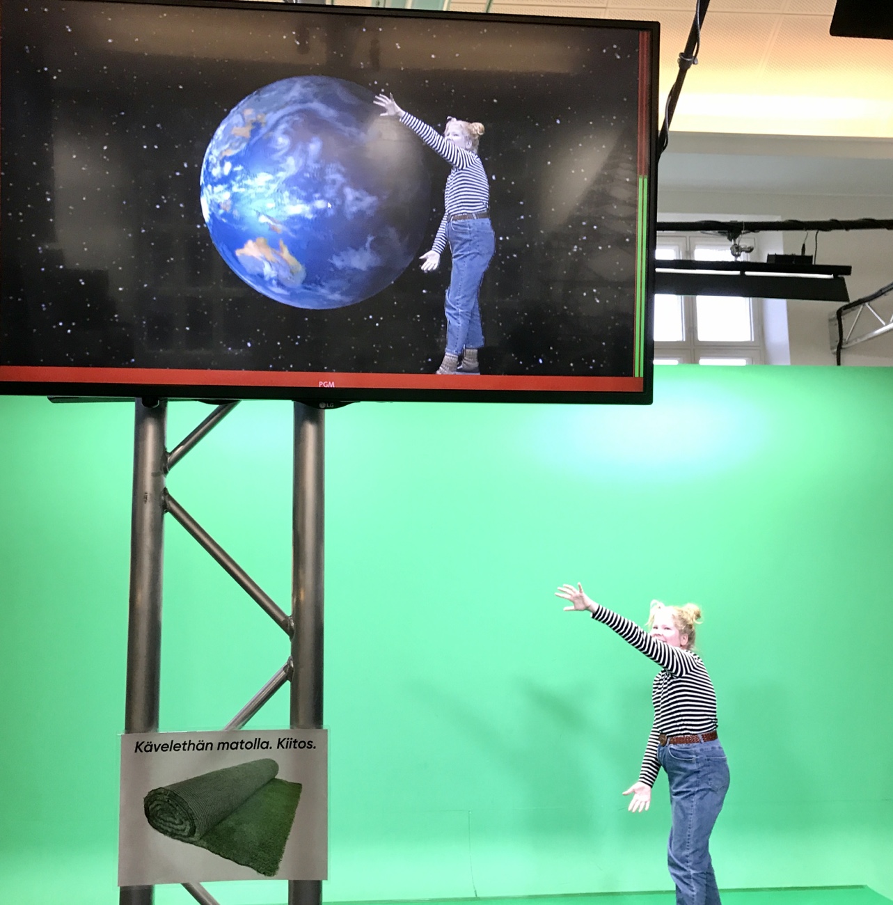 Mutta museon hauskinta antia oli pelleillä vihreän kankaan edessä. Pääsin pitämään käsissäni maapalloa ja tytöt pääsivät Valkoisen talon nurmelle ja Iita rapsutti kissaa, tietysti.