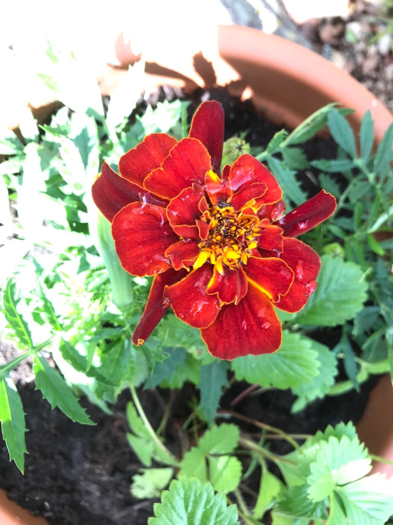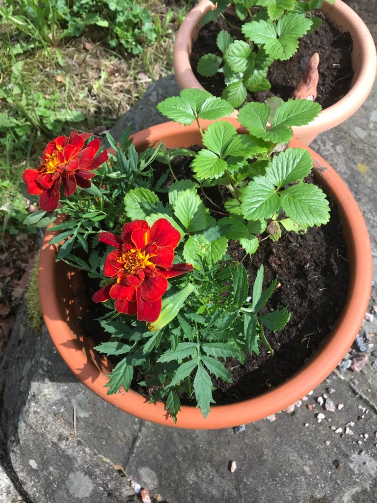 Rautakaupan kesämyymälässä ihanat kukkataimet, hyötypensaat, ruusun- ja puuntaimet väläyttivät näkyviin kesän täydessä loistossaan. Olin luvannut kuopustille oman kasvin, hänen valintansa osui jonkinlaiseen samettikukkaan. Lisäksi ostin pelargonian-, syysleimun- ja kausimansikantaimia.