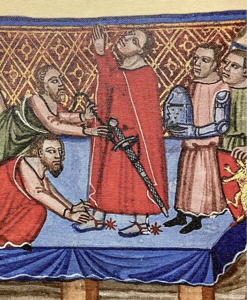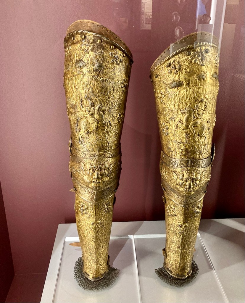 Ritarit-näyttely on rakennettu ja laitettu näytteille hienosti. Salissa on hämyisä tunnelma ja näyttelysalin pehmeissä valoissa on esillä satoja upeita esineitä suoraan keskiajalta. Vitriineissä ja korokkeilla on haarniskoja, aseita, patsaita ja joitakin pieniä kiinnostavia esineitä, kuten kannuksia. Opin näyttelyssä mitä tarkoittaa sanonta ”ansaita kannuksensa”, sillä kun nuori aseenkantaja lyötiin ritariksi, hän sai seremoniassa kannukset uuden asemansa merkiksi. Ja yhdessä vitriinissä loistivat ehkä upeimmat säärystimet, jotka olen koskaan nähnyt; kullanhohtoiset säärisuojat tai oikeastaan jalkasuojat, sillä nämä upeasti koristellut suojat ulottuvat nilkoista nivusiin. Polvien kohdalla on nivelet, jotta jalkoja voi taivuttaa. Mutta luulen että niin nämä suojat kuten haarniskatkin ovat käyttömukavuudeltaan olleet melkoisen epämukavia.