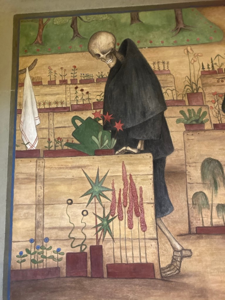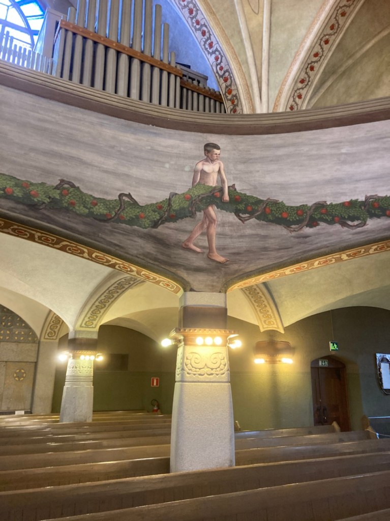 Menin kirkkoon yksin. Toisin kuin aiemmin Porvoossa, kirkon penkit olivat käytössä, joten istuin penkissä tovin ja nautin rauhasta ja Simbergin freskoista. Vaikea kuvitella miten nämä tavallaan rujot freskot ovat aikoinaan herättäneet närää, Kuoleman puutarhan luurangot ja alastomat köynnöksenkantajat olivat monien mielestä sopimattomia kirkkoon, puhumattakaan siitä, että kirkkosalin kunniapaikalle oli maalattu käärme.