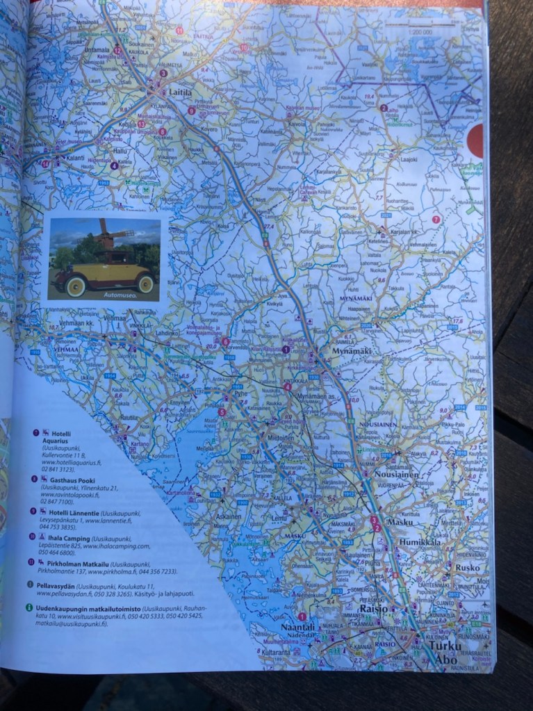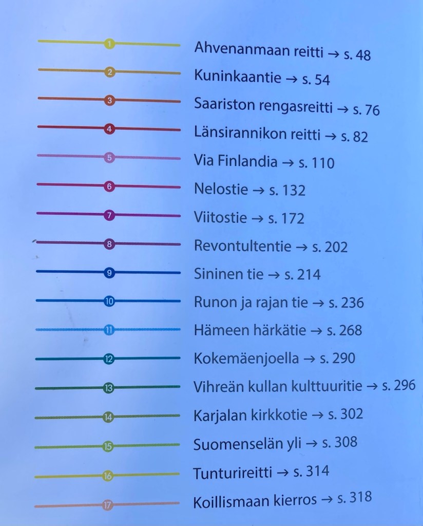 Jo nämä pienet kuvaukset antavat valtavasti tietoa ja esittelevät kunkin etapin ”must” jutut. Lisäksi jokaiselle etapille on varattu aukeama, jossa on alueen TOP-nähtävyydet, muutamia majoituspaikkoja sekä matkailutoimistot. Esimerkiksi opin että Turun ja Uudenkaupungin välillä on Maskun Rosarium, jossa kasvaa 400 historiallista ruusua ja Maskussa on myös Nuuskalan tammimetsä, jonka pohjoisosassa kasvaa suuria tammia, Uudessakaupungissa on Kalannin Pyhän Olavin keskiaikainen kirkko, joka on kuuluisa keskiaikaisista maalauksistaan ja Uudessakaupungissa on Bonk-keskus, joka esittelee uskomattomia koneita.