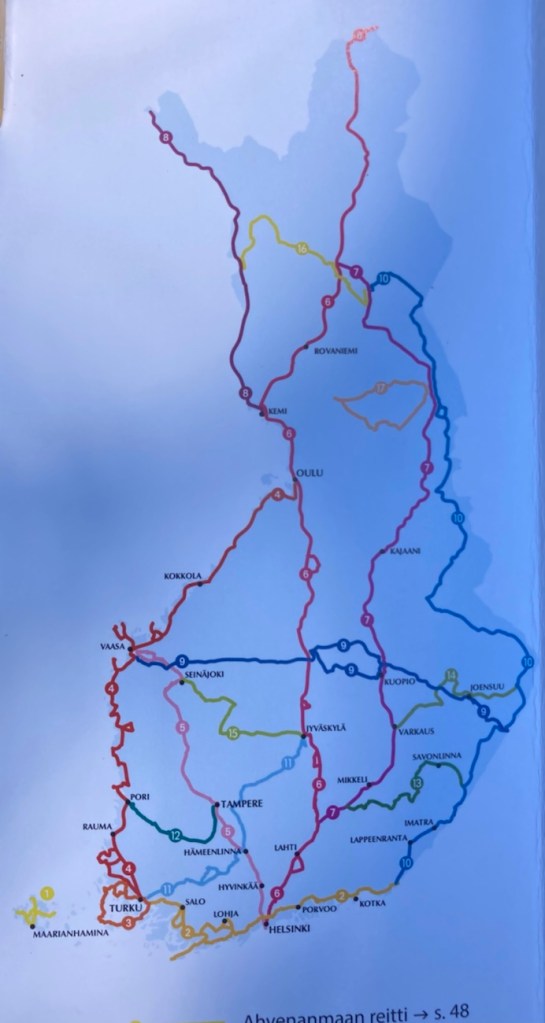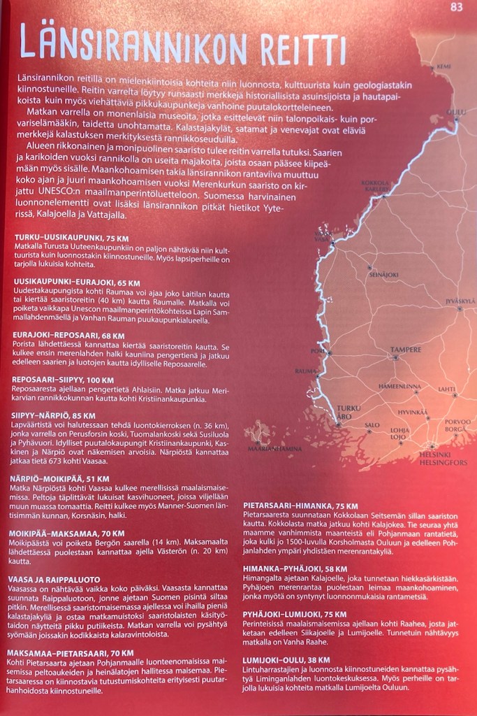 Toinen erittäin houkutteleva reitti on Länsirannikon reitti Turusta Ouluun. Mutta nämä molemmat reitit vaativat jonkin verran aikaa, ainakin jos ei halua tehdä vain läpiajoa vaan oikeasti poikkeaa mielenkiintoisissa paikoissa. (Turusta Ouluun on 633 km, tämä tieto löytyy oppaan viimeisellä sivulla olevasta välimatkataulukosta.)