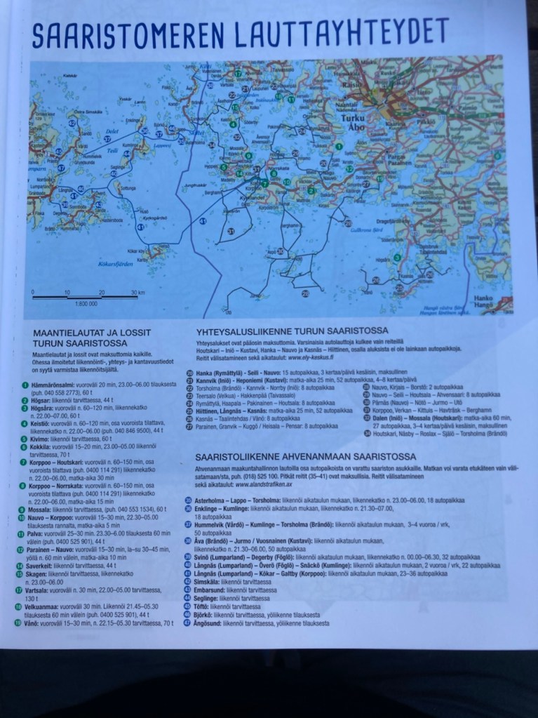 Tiekartaston alkulehdillä on yleistä hyödyllistä tietoa, kuten tietoa Saaristomeren lauttayhteyksistä ja suurimmista matkailukaupungeista. Mutta kuten edellä mainitsin, oppaan suurin anti on matkailureittien kartat sekä etappikuvaukset.