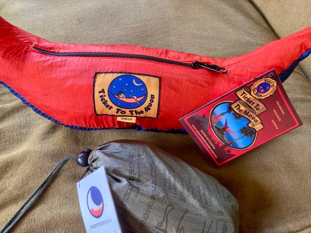 Nyt kun tämä retkeilyasia aktivoitui niin muistin, että minulla on jossain kaapin perukoilla syystä jos toisesta hankittuja Ticket To The Moon -riippukeinuja, joten ostin kokeeksi yhdet Ticket To The Moon -köydet. Nyt kun puran näitä ostoksia tajusin että ihan kiva, mutta ne koukut.. No, etsin YouTubesta ohjevideon Miten virität riippukeinun niin ettei se räsähdä alas kesken keinuttelun? Ja siitä opinkin, että ne koukut ovat jo riippukeinussa.. Joten, me ollaan ns. good to go riippukeinun osalta.
