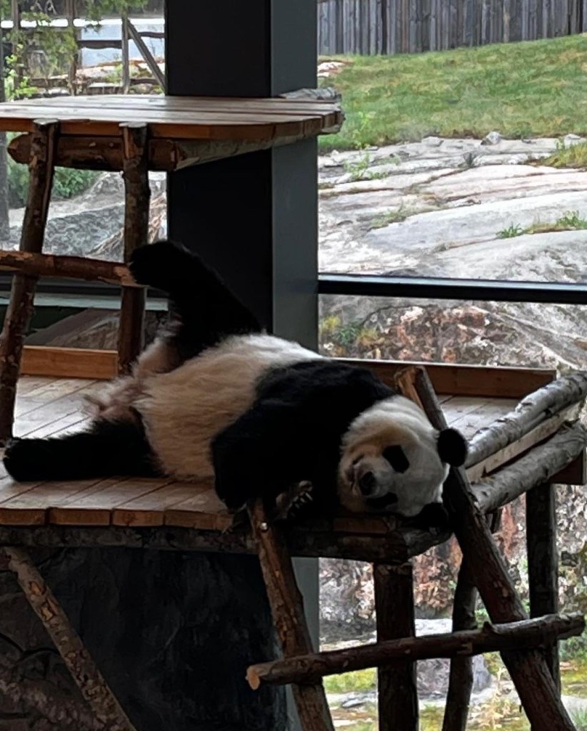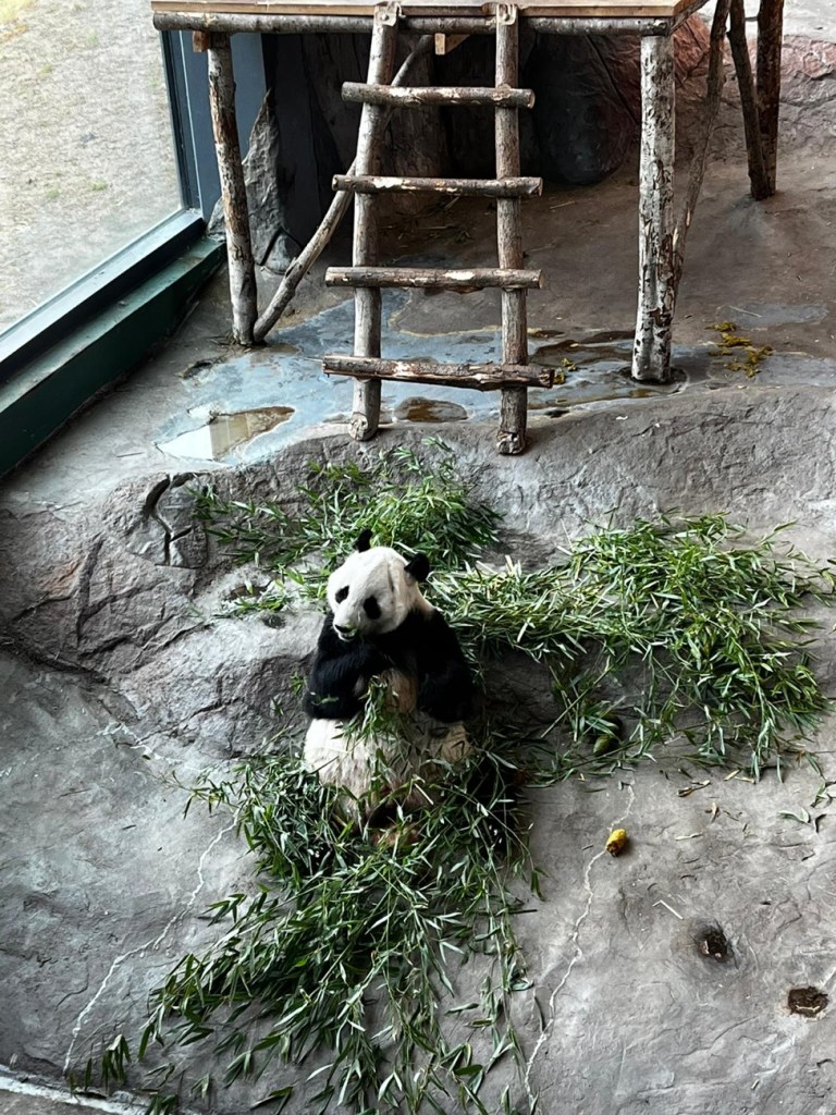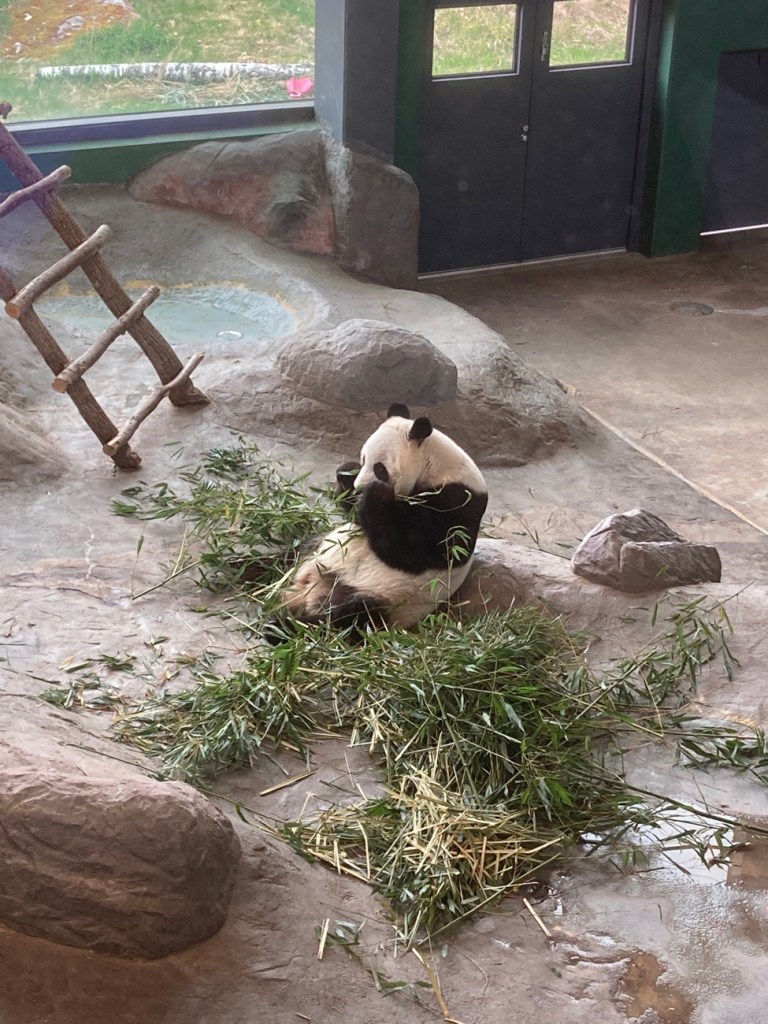 Lähtöpäivänä kävimme katsomassa Lumia ja Pyryä sekä muita eläimiä. Pandat näyttävät suloisilta ja niiden lempiaktiviteetti taitaa olla ruokailu tai nukkuminen. Niillä on sisä- ja ulkotilat. Molempina päivinä Pyry söi koko ajan ja Lumi nukkui. Kun olemme lähdössä ja kävimme vielä kerran pandalassa Lumikin oli hereillä ja -yllätys yllätys- se söi bambua.