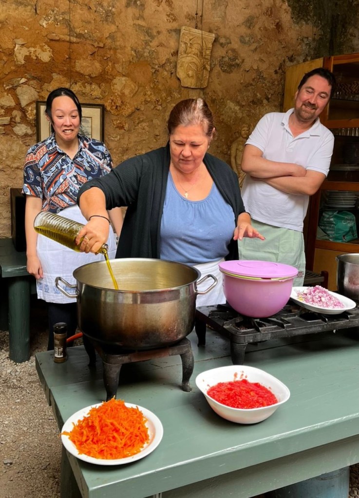 Minähän aloin heti järjestämään asiaa ja muutamien hyvin ystävällisten viestien jälkeen, meille oli varattu mahdollisuus kokkailla pienessä ryhmässä Vamoksen kylän kokkikurssilla lomamme toisena kokonaisena päivänä!