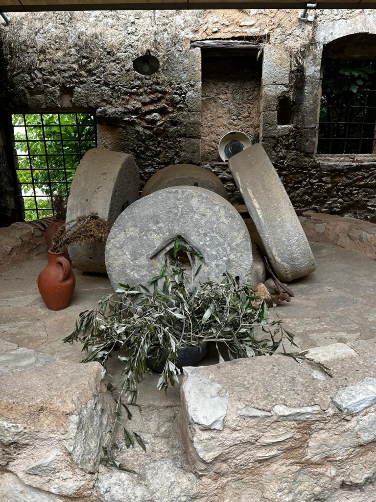Kokkauskurssi pidettiin vanhassa oliivipuristamossa. Menneinä aikoina perheillä oli tällaisia puristamoja, joissa aasivoimalla pyöritettiin raskaita myllynkiviä, jotka puristivat öljyn oliiveista.