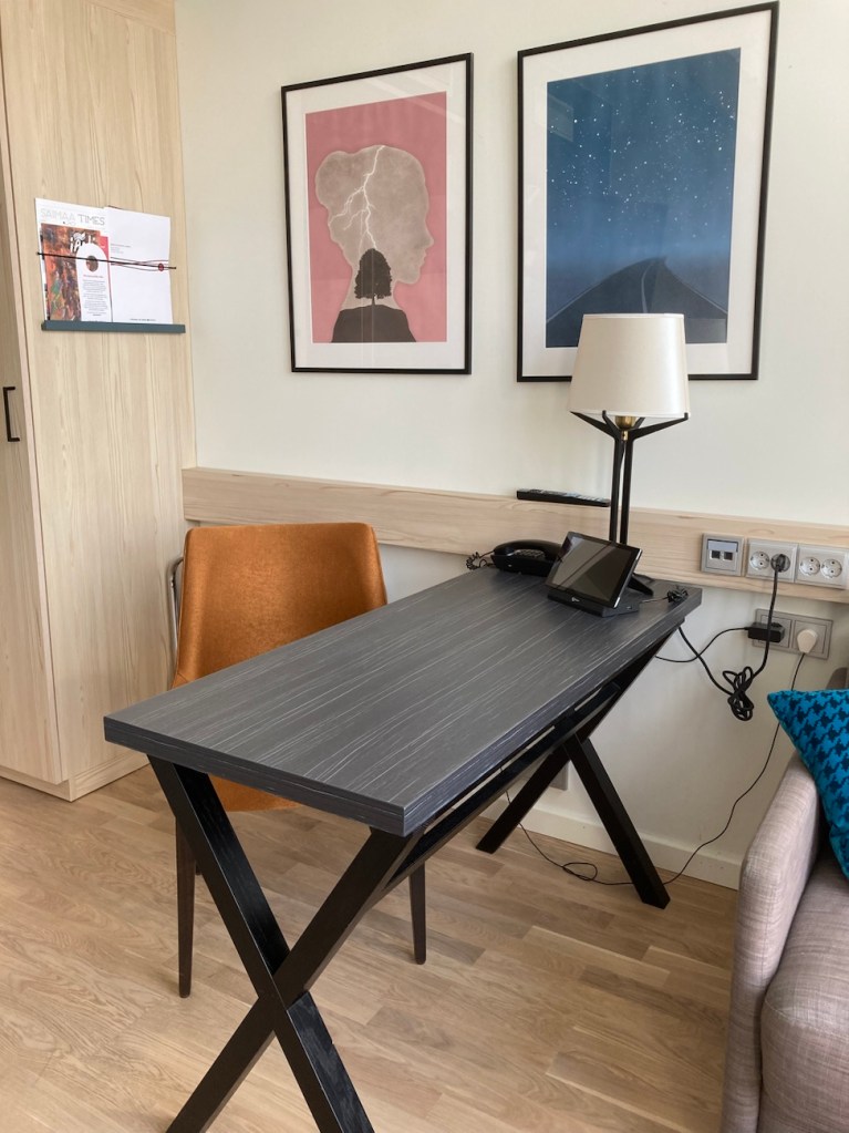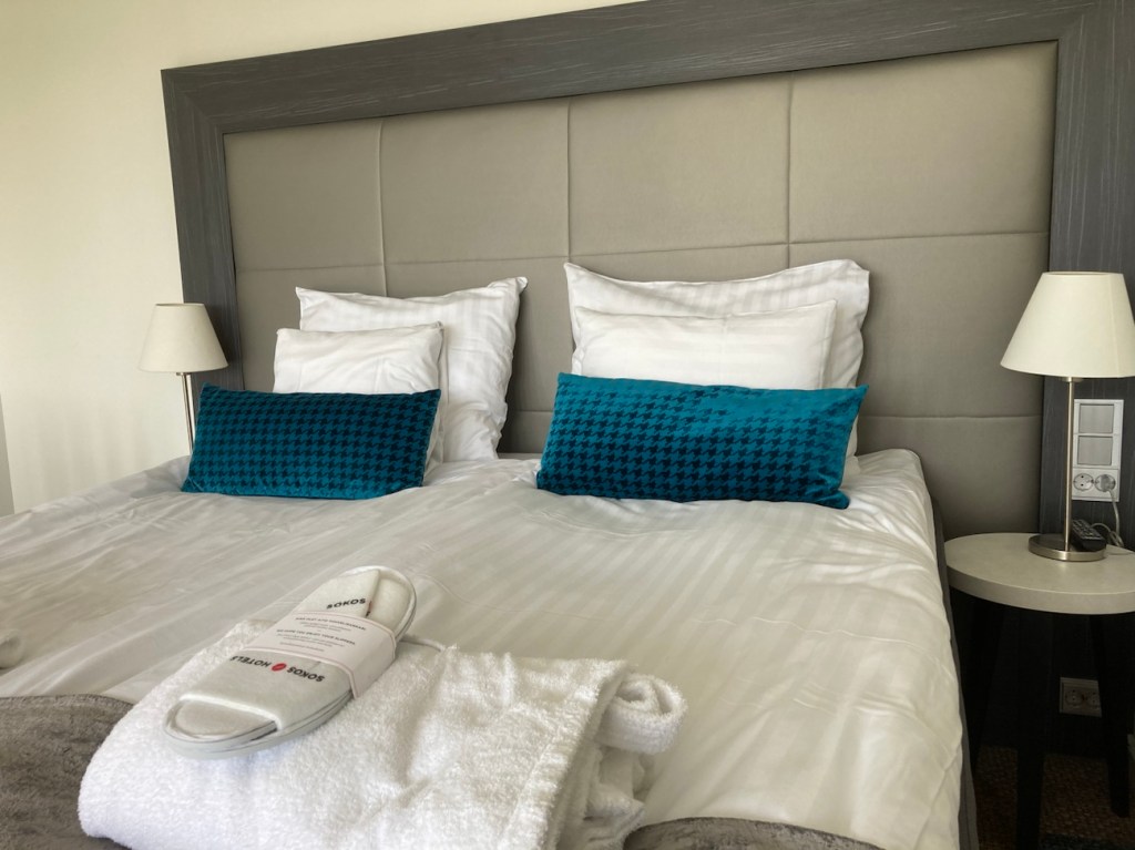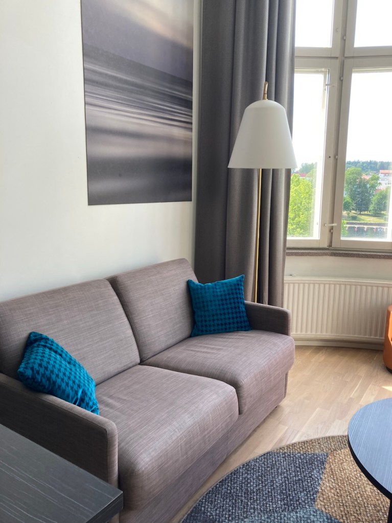 Majoituin Superior-huoneessa. Ja kyllä, huone tarjosi majoittumiseen pientä luksusta Saimaa – näköalalla. Isoista ikkunoista oli esteetön tori- ja järvinäköala ja kuumana kesäpäivänä ikkunat myös tavallaan imivät lämpöä, tätä en kuitenkaan tajunnut ennen kuin huoneeni oli pätsi.