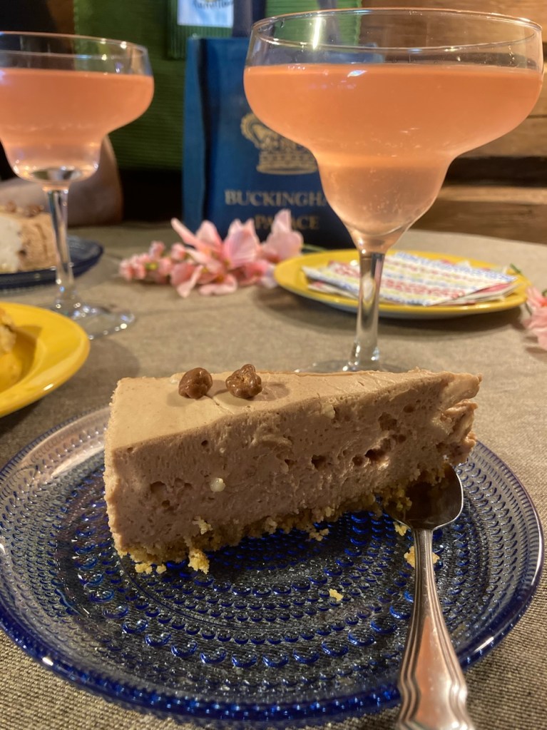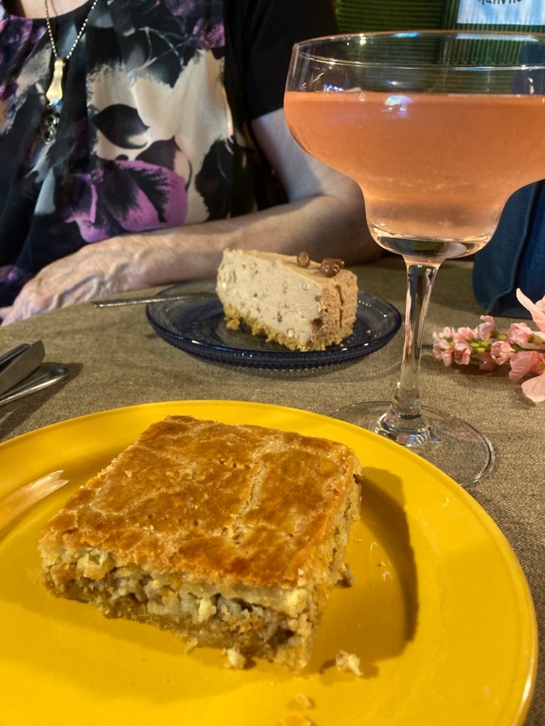 Kahvilan henkilökunta on pukeutunut hobitti tai keijumaisesti ja kahvilan miljöö on viehättävän hobittimainen pyöreine ulko-ovineen. Mutta mites pääasia eli herkut? No, ne ovat todella hyviä. Söimme perinteistä peltilihapiirakkaa sekä jälkipalaksi suffelijuustokakkua ja joimme raparperisimaa. Kaikki oli erittäin hyvää. Ja plussaa vielä upeista simalaseista!