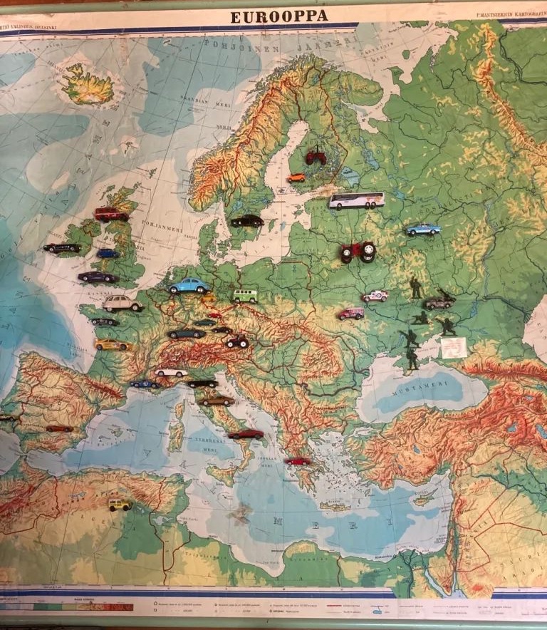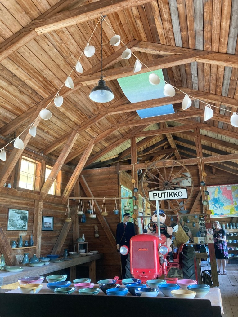 Myös täällä me kohtasimme kokonaistaide-elämyksyn. Kauniisti esille asetellut viehättävät saviesineet, muu esillä oleva taide, leppoisasti tarinoiva saviseppä sekä jännittävä traktori ja yhtä seinää koristava Euroopan kartta, johon on kiinnitetty kunkin maan autoja! Kerrassaan riemastuttava kokonaisuus.