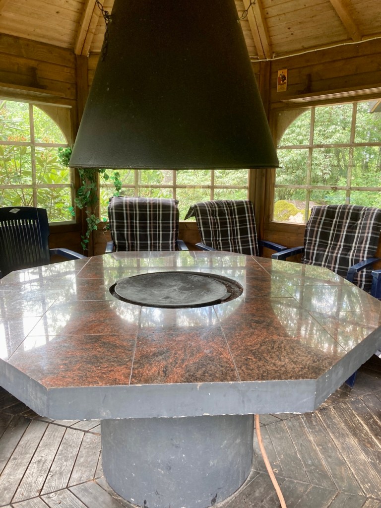 Emme tällä kertaa testanneet huvimaja, koska söimme enne paljuttelua, mutta mies oli aiemmalla kerralla tehnyt useamman kerran ruokaa huvimajassa grillaillen ja tykkäsi huvimajan grillistä. Mökin terassilla oli myös perinteinen kaasugrilli.