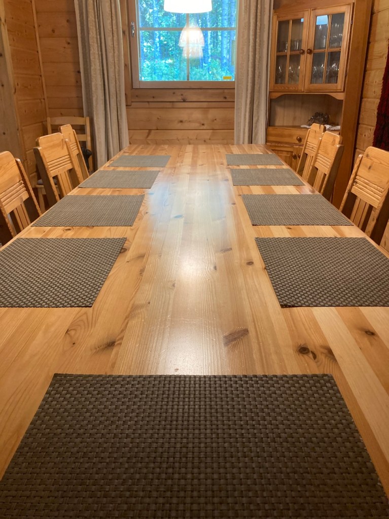 Saavuimme mökille hieman ennen sovittua aikaa klo 15 ja paikalla oli vielä siivooja. Mökissä olikin todella siistiä. Keittiö oli melko pieni, mutta erittäin hyvin varusteltu. Ruokailutilassa oli iso ruokapöytä, joten isokin porukka mahtuu hyvin saman pöydän ääreen.